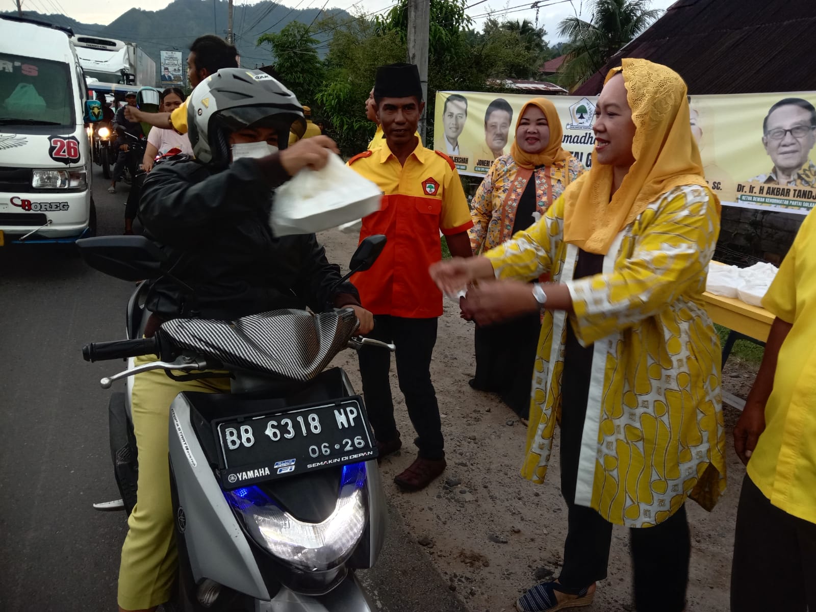 Tapanuli Tengah | SinarlintasNews.com – Fitri Krisnawati Tanjung, putri sulung Akbar Tanjung bersama Ketua DPD II Golkar Tapteng, Joneri Sihite membagikan takjil kepada masyarakat yang melintas di Jalan Padah Sidimpuan, Kelurahan Sibuluan Indah, Kecamatan Pandan, Kabupaten Tapanuli Tengah, Rabu (12/4/23).