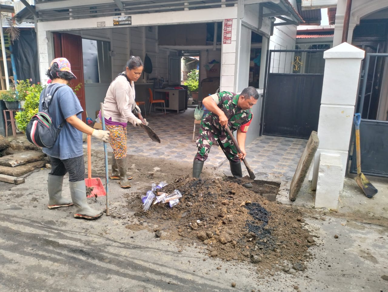 Gotong royong yang digelar bersama warga menyasar seputaran lingkungan pemukiman. Seperti, membersihkan parit dari material sampah dan lumpur. Juga membersihkan sampah yang berserakan di sepanjang jalan.