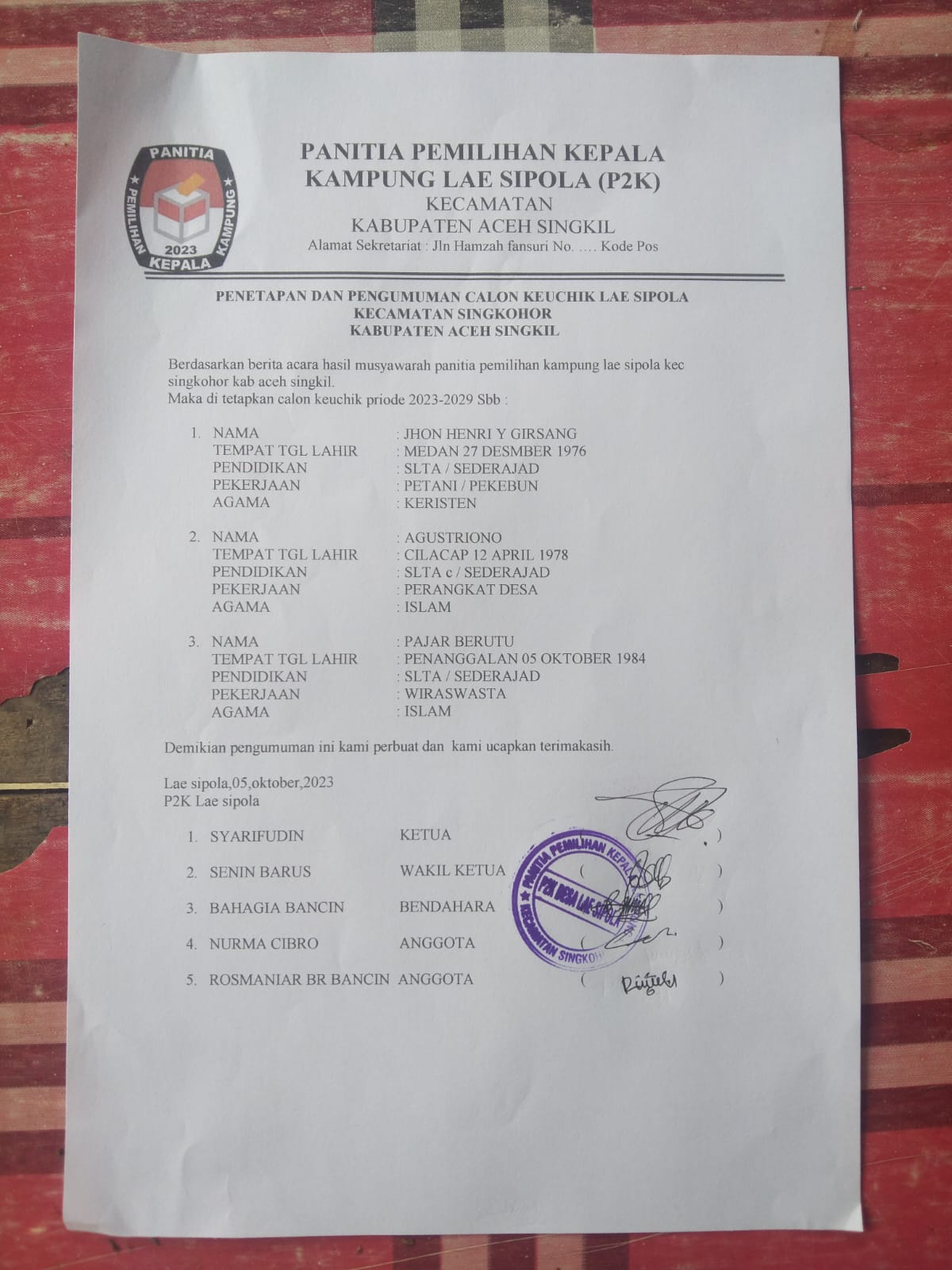 Penetapan calon Keuchik Desa Lae Sipola yang ditandangani Ketua Panitia P2K Desa Lae Sipola, Syarifudin pada tanggal (5/10/23) dengan menetapkan 3 calon kandidat yakni, Jhon Henri Y Girsang, Agustriono, dan Pajar Berutu diduga menyalahi aturan dalam proses perekrutan dan penetapan calon Kepala Desa.