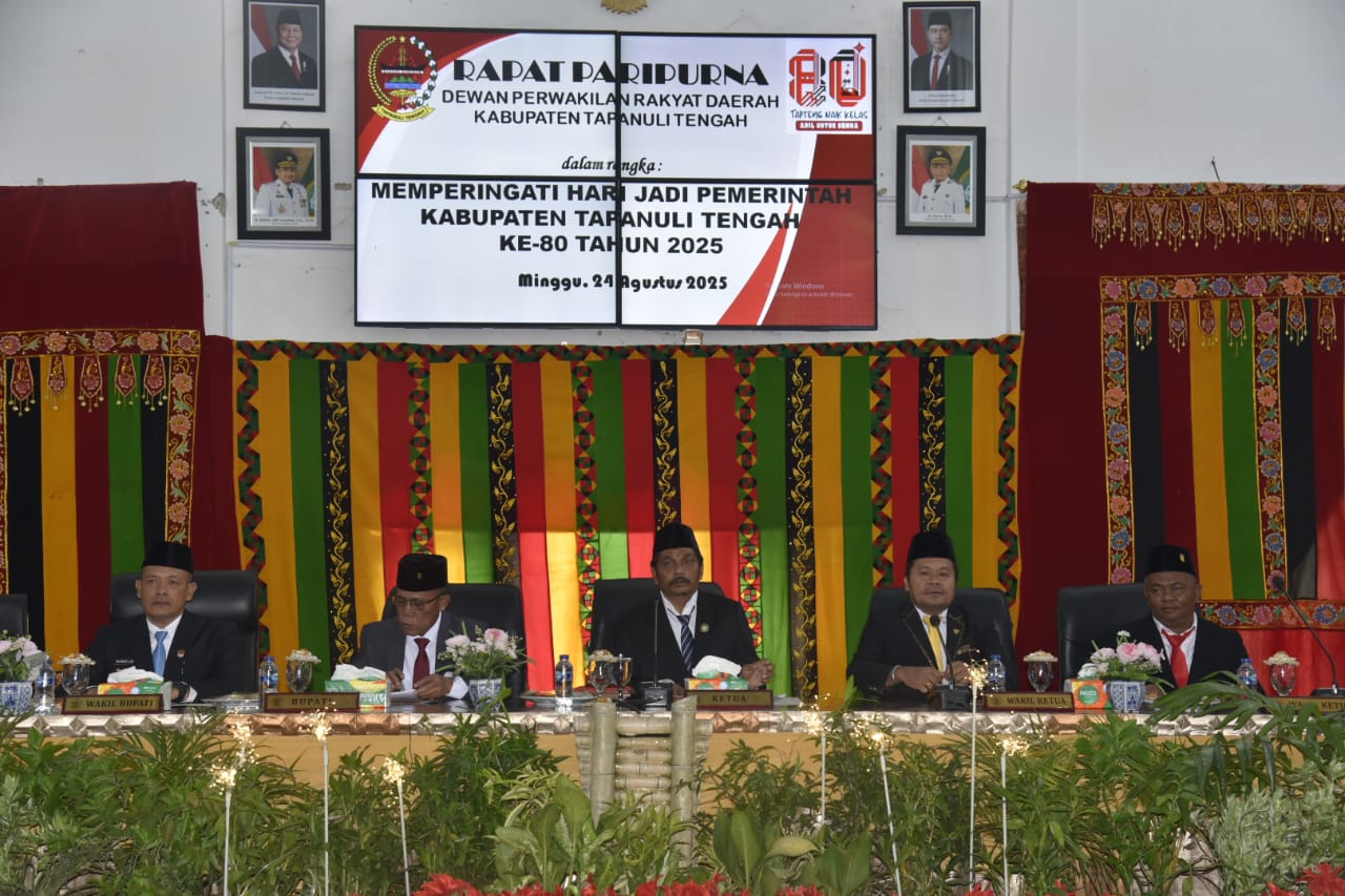 Tapanuli Tengah – Dewan Perwakilan Rakyat Daerah (DPRD) Kabupaten Tapanuli Tengah menggelar rapat paripurna istimewa untuk memperingati Hari Jadi Pemerintah Kabupaten Tapanuli Tengah (HUT Tapteng) ke-80, Minggu (24/8/2025), di Ruang Rapat Paripurna DPRD.