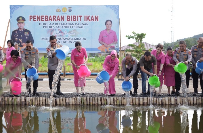 TAPTENG – Kapolda Sumatera Utara Irjen Pol. Whisnu Hermawan Februanto memimpin kegiatan penebaran bibit ikan di Kolam Ketahanan Pangan Polres Tapanuli Tengah, Jalan Faisal Tanjung, Pandan, Selasa (16/9/2025).