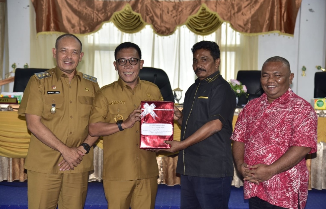 Foto: Bupati Tapanuli Tengah 🥬Masinton Pasaribu bersama wakil Bupati, Mahmud Efendi saat menyerahkan Rancangan Perubahan APBD Tahun Anggaran 2025 kepada Ketua DPRD Tapteng, Ahmad Rivai Sibarani didampingi Wakil Ketua, Disman Sihombing pada Selasa (23/9/25) di Gedung DPRD Tapteng.